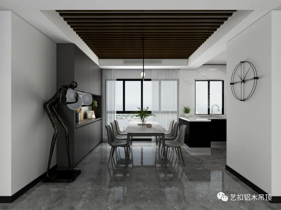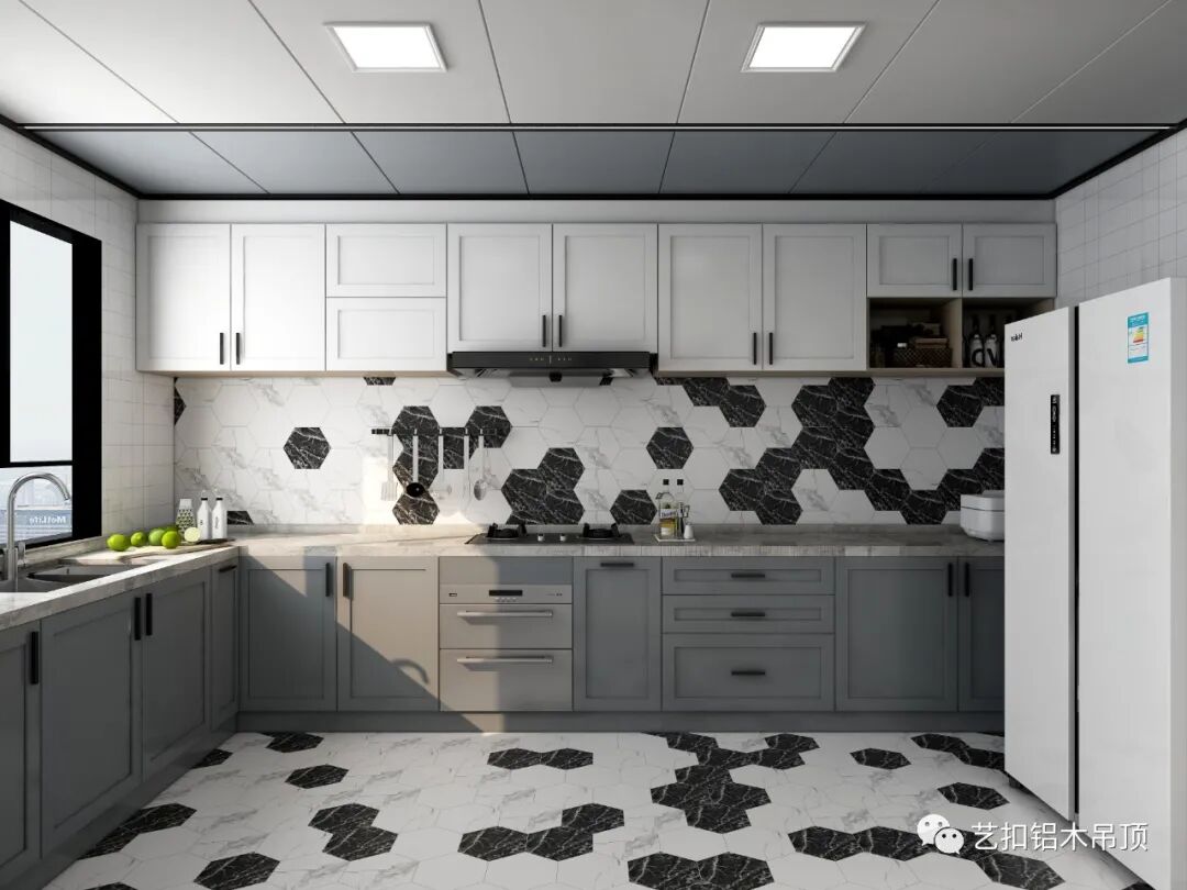 改变以往传统厨房吊顶的形式,采用哑光白+矿岩蓝大板,在视觉上给人更加大气简洁的感觉。